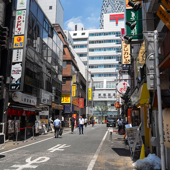 JR・各地下鉄・私鉄が集う巨大ターミナルからアクセス可能な環境で、周囲には新宿郵便局や高層ビル、ヨドバシカメラや百貨店等が揃い、様々な人が行き交っております。